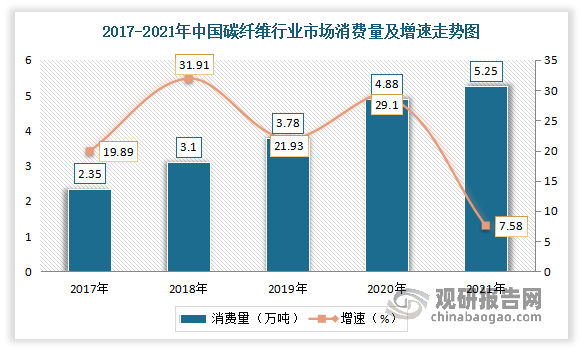 受體育用品及風(fēng)電葉片的強(qiáng)勁增長(zhǎng)帶動(dòng),2017-2021年中國(guó)碳纖維消費(fèi)量不斷增長(zhǎng)。數(shù)據(jù)顯示,2020年我國(guó)碳纖維消費(fèi)量達(dá)4.88萬(wàn)噸,同比增長(zhǎng)29.1%;2021年我國(guó)碳纖維消費(fèi)量為5.25萬(wàn)噸,同比增長(zhǎng)7.58%。