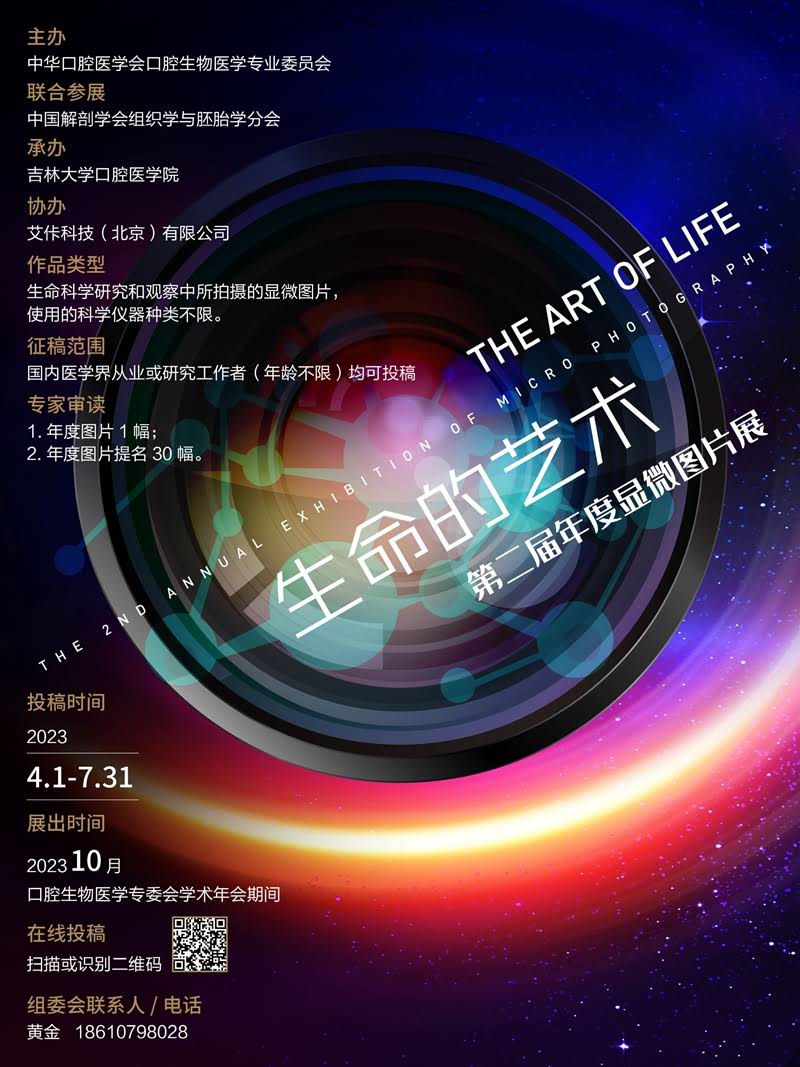 為了進一步促進科學文化發(fā)展,活躍專委會科技人文氛圍,培養(yǎng)大家在科研工作中的創(chuàng)新意識,激發(fā)科研工作者發(fā)現(xiàn)美、創(chuàng)造美的熱情和興趣,專委會于2021年舉辦了“生命的藝術(shù)-—首屆年度顯微圖片展”,并取得圓滿成功(點擊此處即可查看活動回顧)。專委會決定今年將繼續(xù)舉辦“生命的藝術(shù)-—第二屆年度顯微圖片展”,入選作品將在2023年度口腔生物醫(yī)學學術(shù)年會上展示。此外,本次活動將與中國解剖學會組織學與胚胎學分會聯(lián)合舉辦,以打開口腔領(lǐng)域的邊界,通過顯微鏡記錄下更多瑰麗多彩的生命現(xiàn)象、奧妙無窮的人體組織、復雜多變的疾病形態(tài),內(nèi)觀己心,外察世界。