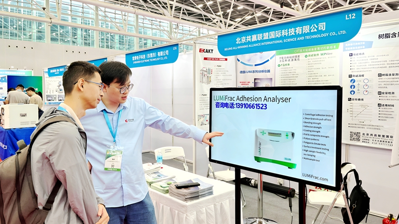 三天展會期間,北京共贏聯(lián)盟的技術(shù)人員向蒞臨展位的各位專家、老師、企業(yè)領(lǐng)導(dǎo)和技術(shù)人員介紹了快速無損檢測樹脂含量工藝技術(shù),膠黏劑的粘附力與粘結(jié)強度測試分析整體解決方案,高分子材料研磨分散技術(shù)及其穩(wěn)定性測試分析等。