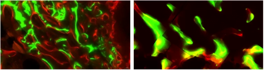 圖7 股骨髁植入(茜素紅和鈣黃綠素標(biāo)記)