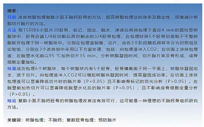 基因在許多骨病病程中發(fā)揮著重要的調(diào)控作用[1]。近年來(lái),隨著基因編輯技術(shù)的發(fā)展以及新的骨病靶點(diǎn)基因的不斷發(fā)現(xiàn),基因編輯動(dòng)物模型在骨病研究中的應(yīng)用越來(lái)越廣泛[2-5]。在骨病研究中,對(duì)骨骼組織變化進(jìn)行多個(gè)水平的檢測(cè)是各個(gè)實(shí)驗(yàn)的中心環(huán)節(jié),在組織學(xué)水平,獲取體內(nèi)實(shí)驗(yàn)數(shù)據(jù)的金標(biāo)準(zhǔn)方法是對(duì)組織進(jìn)行包埋切片及染色分析,石蠟包埋法及樹脂包埋法是最常用于包埋骨組織的方法[6]。成熟骨組織質(zhì)地堅(jiān)硬且脆,使用石蠟包埋前要對(duì)骨組織進(jìn)行脫鈣處理[7]。但脫鈣后,石蠟切片無(wú)法用于骨形成及礦化沉積的分析,而骨形成及礦化沉積是衡量骨重建功能的不可替代的指標(biāo)[8]。為了能夠完整保留骨骼的成分并進(jìn)行切片分析,有研究提出不需脫鈣的樹脂包埋法[9]。樹脂包埋法中以樹脂液代替石蠟,凝固后的樹脂標(biāo)本質(zhì)地堅(jiān)韌,不易碎裂,適用于不脫鈣骨組織切片及分析[10-14]。樹脂包埋切片法現(xiàn)被認(rèn)為是骨組織學(xué)研究的最佳方法之一[6]。傳統(tǒng)的樹脂包埋切片法仍存在樹脂凝固時(shí)間長(zhǎng)、樹脂凝固不完全、在切片采集及染色過(guò)程中容易脫片等缺點(diǎn)[15-16]。
