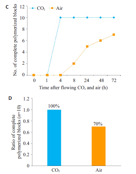 圖1 向包埋液沖入二氧化碳可以縮短包埋液的凝固時(shí)間Fig.1 Flowing CO2 into the embedding solution reduces polymerization time. A: Schematic diagram of flowing CO2 into theembedding solution; B: Represent pictures showing polymerization of the blocks in CO2 and air groups at 0, 1, 4, and 8 h. The pictures were taken immediately after tilting the vial to observe the viscosity and polymerization of the solution; C: Number of complete polymerized blocks of CO2 and Air groups over time(n=10); D: Rate of complete polymerized blocks of CO2 and Air groups (n=10).