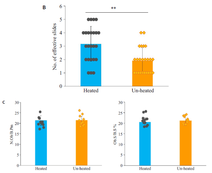將實(shí)驗(yàn)條件設(shè)置為95 ℃加熱15 min,通過(guò)計(jì)數(shù)發(fā)現(xiàn),加熱組在脫塑水化后每張切片剩余有效脛骨切面數(shù)3.17±1.31,脫片率為(28.97±0.29)%。不加熱組在脫塑水化后每張切片剩余有效脛骨切面數(shù)1.92±0.97,脫片率為(56.60±0.22)%。脫塑前加熱切片可顯著性減少脫塑及水化操作造成的脫片(P<0.001,圖4B)。隨后對(duì)切片進(jìn)行了甲苯胺藍(lán)染色觀察成骨細(xì)胞的情況,結(jié)果顯示,加熱并不會(huì)影響對(duì)甲苯胺藍(lán)染色的染色。加熱組和不加熱組的成骨細(xì)胞分析N.Ob/B.Pm和Ob.S/B.S結(jié)果差異無(wú)統(tǒng)計(jì)學(xué)意義(P>0.05,圖4C)。