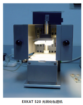 把浸透好的樣品塊移入包埋盒中,(注意讓觀察的樣品面朝下),把T 7200膠倒入包埋盒中,直至淹沒(méi)樣品。然后,啟動(dòng)燈光開(kāi)關(guān)。光固化分兩個(gè)階段,第一階段,使用低強(qiáng)度黃色光源,使包埋劑予以聚合。對(duì)10mm厚的樣品塊,約需時(shí)間4—5小時(shí)。第二階段,使用強(qiáng)光源藍(lán)色光源進(jìn)一步聚合,約需時(shí)間8—10小時(shí)。第一階段和第二階段之間的切換,由儀器按照設(shè)定的時(shí)間程序自動(dòng)完成,只需在藍(lán)色光源熄滅后,關(guān)閉儀器電源開(kāi)關(guān)而已。固化過(guò)程可以安排在下班前進(jìn)行,第二天上班時(shí),即可以拿到固化好的樣品,其效率之高不言而喻。