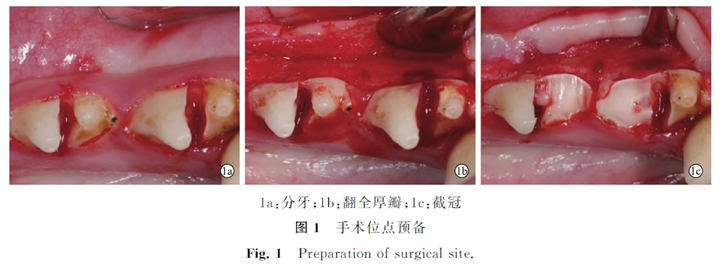 術(shù)前準(zhǔn)備:術(shù)前5d對(duì)實(shí)驗(yàn)動(dòng)物行CBCT檢查及齦上潔治術(shù)。實(shí)驗(yàn)動(dòng)物術(shù)前12h禁食禁水。麻醉:按0.1mL/kg體重于比格犬后肢內(nèi)側(cè)肌注鹽酸塞拉嗪(速眠新Ⅱ,吉林省敦化市圣達(dá)動(dòng)物藥品有限公司)3%戊巴比妥鈉溶液(1mL/kg)進(jìn)行全身麻醉。術(shù)中密切觀察,若蘇醒,則使用速眠新初始用量的1/2進(jìn)行補(bǔ)充麻醉。待麻藥起效后,固定動(dòng)物,使用1%碘伏進(jìn)行口內(nèi)消毒,鹽酸腎上腺素阿替卡因注射液(必蘭公司,法國(guó))自第3前磨牙(P3)近中至第4前磨牙(P4)遠(yuǎn)中行局部浸潤(rùn)麻醉。分牙、翻瓣、截冠:用高速手機(jī)及金剛砂車針將P3P4的近遠(yuǎn)中牙冠分開(kāi)(1a),P3近中至P4遠(yuǎn)中作齦溝切口,翻全厚瓣(1b),依據(jù)術(shù)前CBCT分析各位點(diǎn)牙槽骨量,略高于牙槽嵴磨除遠(yuǎn)中或近中牙冠,作為手術(shù)位點(diǎn)(圖1c)。