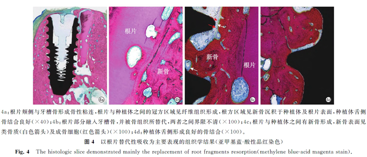 觀察到兩種結(jié)果。第一種結(jié)果主要表現(xiàn)為根片發(fā)生替代性吸收。頰側(cè)牙槽嵴未見(jiàn)明顯吸收,根片頰側(cè)與牙槽骨形成骨性愈合,其間無(wú)纖維結(jié)締組織,根片部分融入牙槽骨,并被骨組織所替代,兩者之間界限不清(4a、圖4b)。根片與種植體之間部分區(qū)域見(jiàn)纖維組織形成,部分區(qū)域見(jiàn)新骨充填,新骨表面見(jiàn)類骨質(zhì)及成骨細(xì)胞(4a、圖4c)。種植體舌側(cè)骨結(jié)合良好(4a、圖4d)。