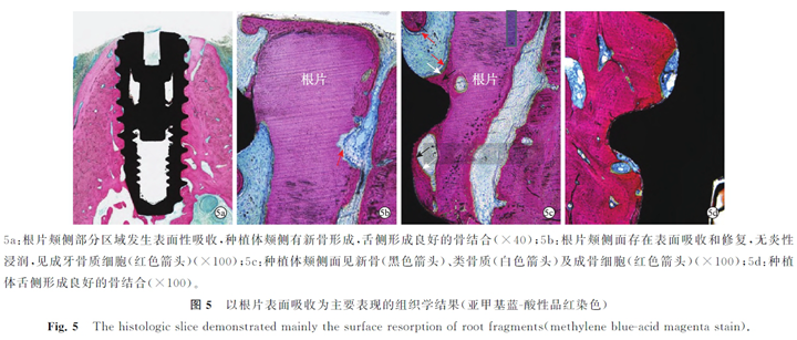 2種主要表現(xiàn)為根片發(fā)生表面吸收。頰側(cè)牙槽嵴未見(jiàn)明顯吸收。根片頰側(cè)面同時(shí)見(jiàn)表面吸收及成牙骨質(zhì)細(xì)胞修復(fù),軟組織內(nèi)未見(jiàn)炎性浸潤(rùn)(5a、圖5b)。種植體頰側(cè)面見(jiàn)新骨、類骨質(zhì)及成骨細(xì)胞(5c),種植體舌側(cè)形成良好的骨結(jié)合(5a、圖5d)。